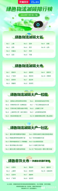 11月1日到6日期间,菜鸟驿站回收数量和绿色循环寄件数量显示,上海市、云南省、内蒙古自治区、北京市、吉林省、四川省、天津市、宁夏回族自治区、安徽省、山东省是这届双11的物流减碳大省(包含省、直辖市和自治区),其中上海市为新晋榜首。西安市、广州市、郑州市、南通市、成都市、南京市、武汉市、苏州市、深圳市、济南市则是绿色物流减碳大市。