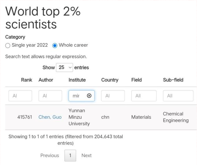 根据科睿唯安2023年11月9日公布的最新ESI(Essential Science Indicators,基本科学指标)数据显示,云南民族大学化学学科首次进入ESI全球排名前1%。在ESI与美国斯坦福大学John R.A. Ioannidis教授团队近期发布的第六版《全球前2%顶尖科学家榜单2023》中,云南民族大学化学与环境学院陈菓教授在化学工程领域入选本期“终身科学影响力排行榜”。