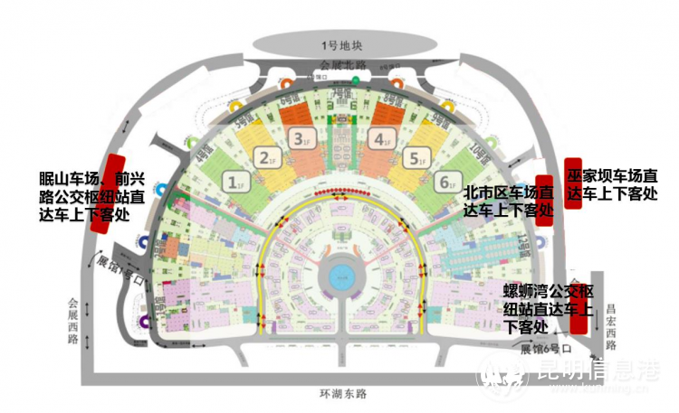 螺蛳湾公交枢纽站(南部汽车站旁)——滇池会展中心。营运时间:螺蛳湾公交枢纽站首班车8:30,滇池会展中心返程末班车18:40。票价5元,不使用IC卡。