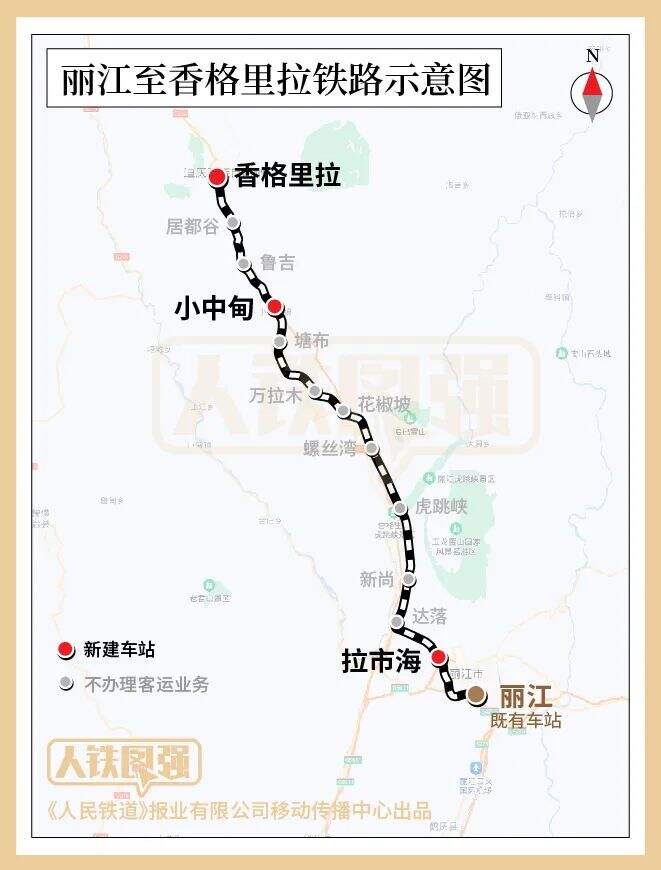 丽香铁路起自云南省丽江市玉龙纳西族自治县丽江站,接入云南省迪庆藏族自治州香格里拉市香格里拉站,设计时速140公里,全长139公里,为国家Ⅰ级单线电气化铁路。全线共设13个车站,分别为丽江、拉市海、达落、新尚、虎跳峡、螺丝湾、花椒坡、万拉木、塘布、小中甸、鲁吉、居都谷、香格里拉站,其中丽江站为既有车站、其余为新建车站。丽江、拉市海、香格里拉站开办客运业务,小中甸站开办客、货运业务,其余车站为铁路行车技术作业站。
