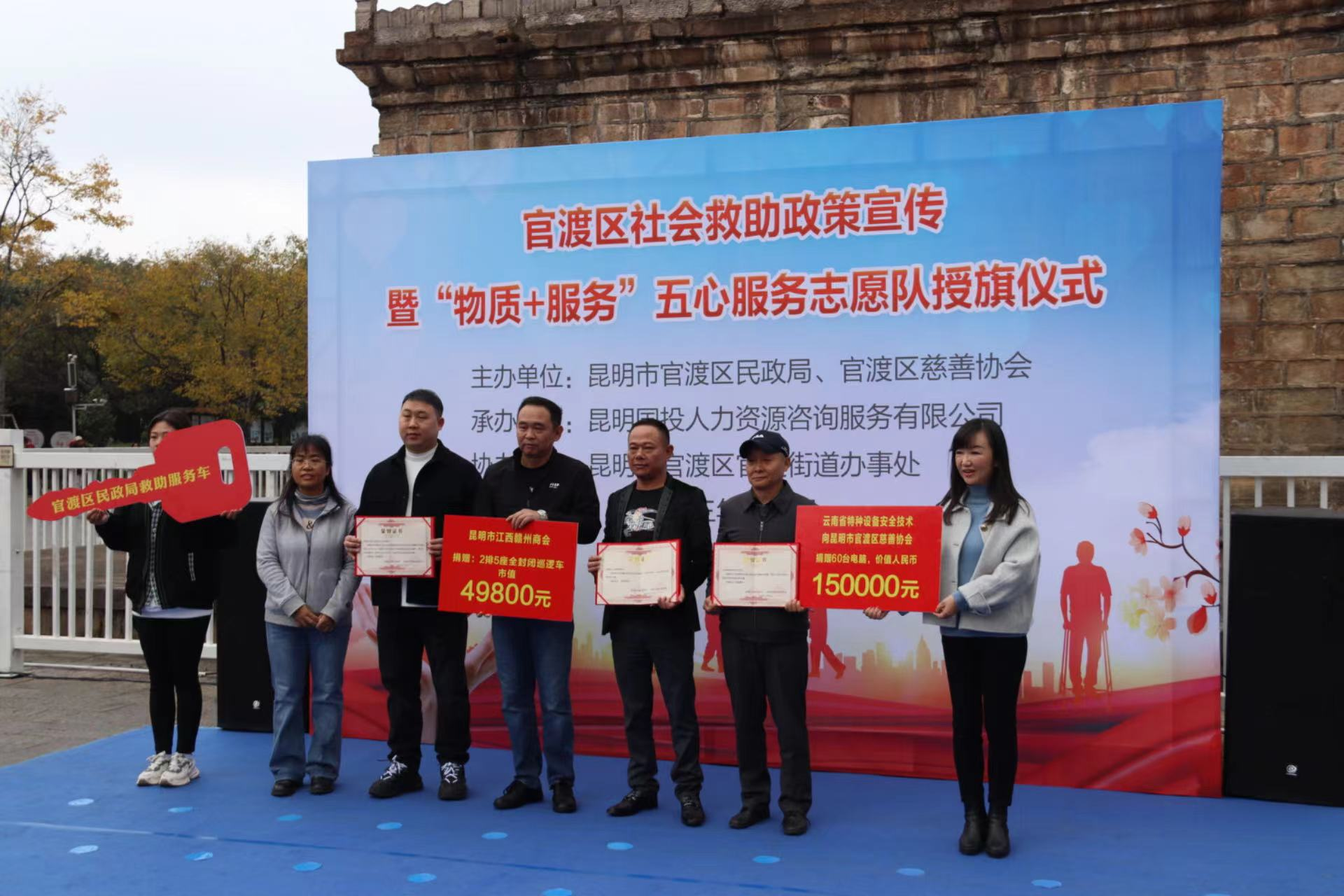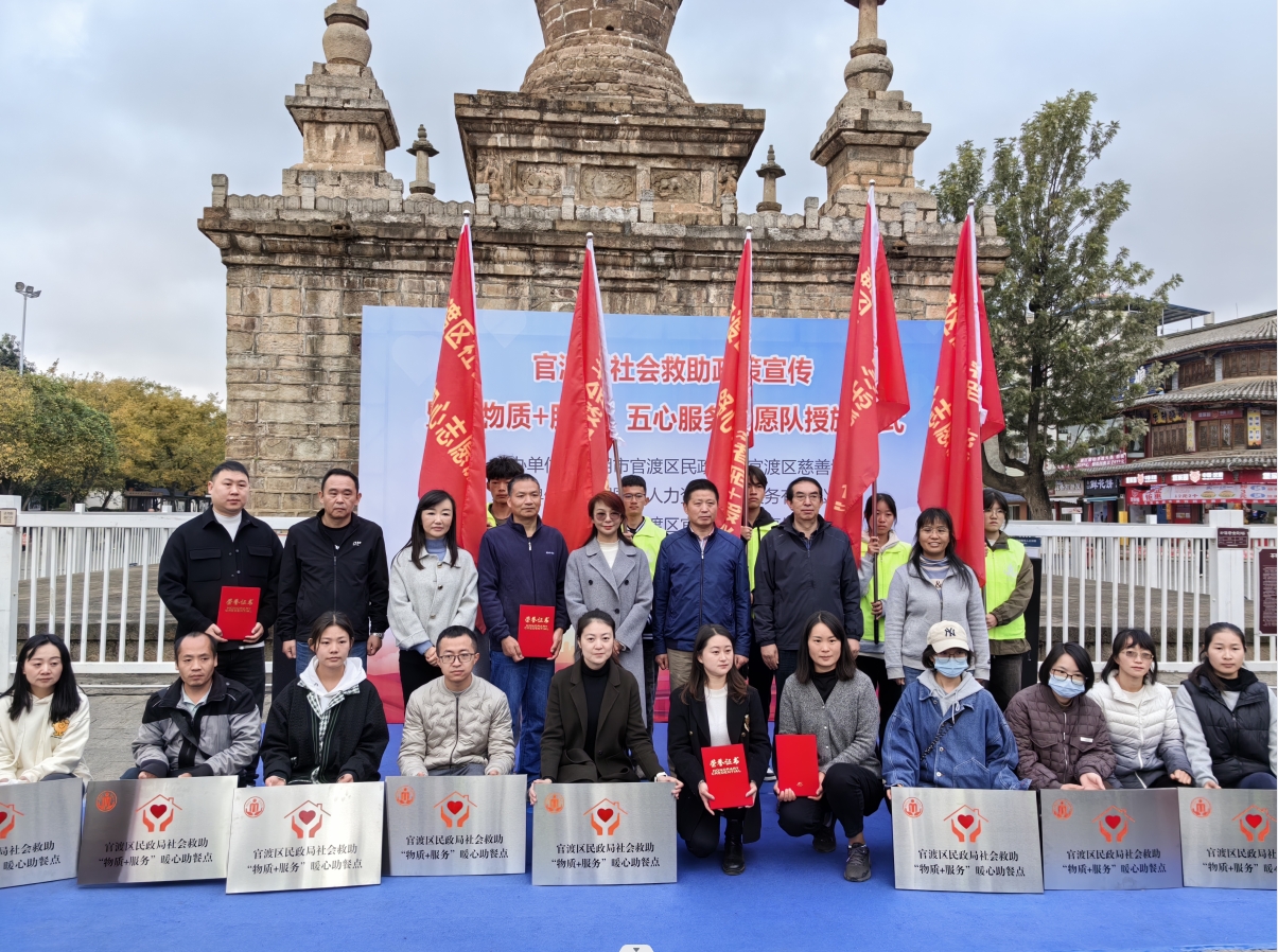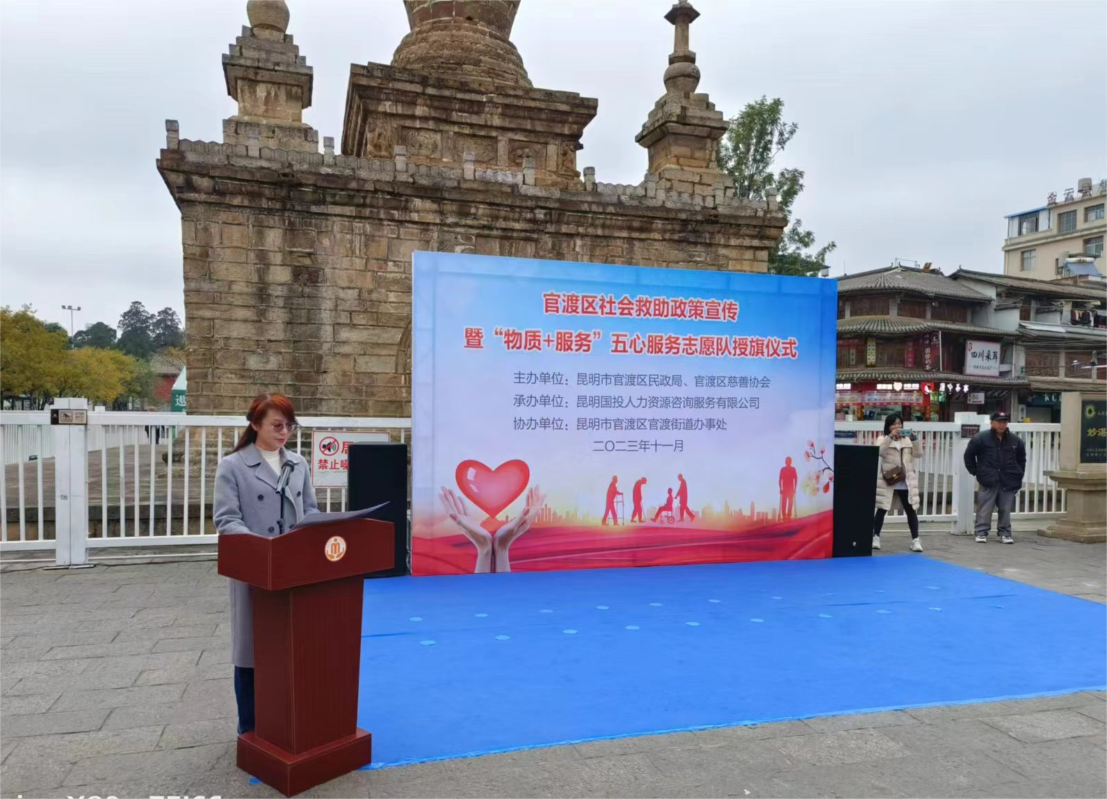 昆明信息港讯 记者朱俊杰 龙泉积 11月30日,昆明市官渡区民政局在官渡古镇金刚塔广场举办“社会救助政策宣传暨‘物质+服务’五心服务志愿队授旗仪式”,昆明市民政局、昆明市慈善总会、官渡区人民政府、官渡区民政局相关领导,官渡区各街道、社区相关负责人、企事业单位、社工机构、慈善组织代表参加了本次活动。
