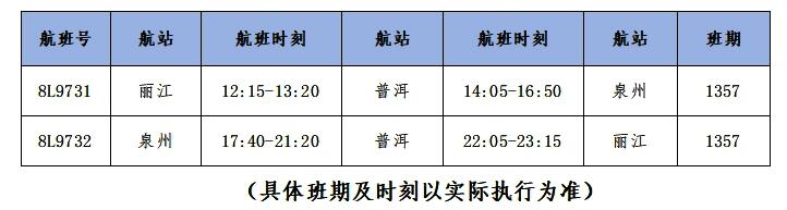 据悉,丽江=普洱=泉州航线,去程航班号为8L9731,12:15从丽江起飞,13:20抵达普洱,14:05从普洱起飞,16:50抵达泉州;回程航班号为8L9732,17:40从泉州起飞,21:20抵达普洱,22:05从普洱起飞,23:15抵达丽江。