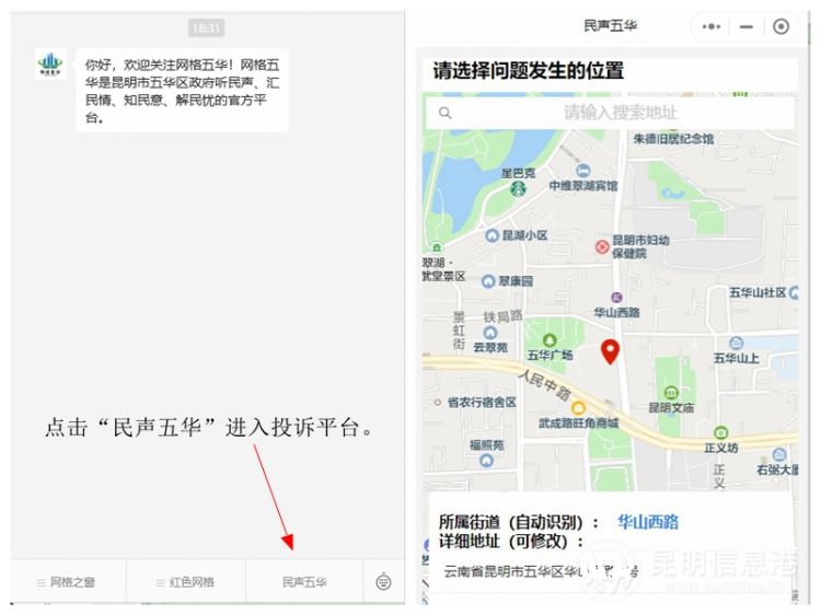 “除了能‘看’,‘诉’与‘联’才是网格五华微公号更达到的主要作用。”负责人介绍,群众可以通过微公号菜单栏中的“民声五华”进入五华区群众诉求线上投诉微平台,把自己想投诉的内容或是掌握的线索按照提示上传平台即可完成投诉,网格管理中心将统一研判后流转至职能部门限期处置,并督促跟进,及时反馈群众办理结果,诉求处置效果同步纳入对办理部门的月度考核评价。