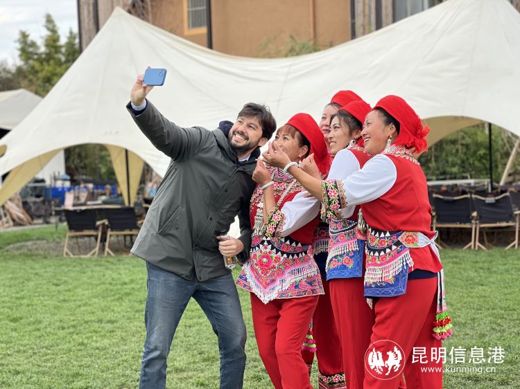 除此之外,参访团还前往位于滇池河畔的晋宁区小渔村,在有水、有船、有院、有田、有人家的村落旁,围着点燃的篝火,观赏由当地村民表演的彝族秧佬鼓舞。随着演出进入高潮,嘉宾们不禁被村民们的热情所感染,纷纷加入到打跳的队伍中,沉浸式体验云南少数民族歌舞的活力与激情。