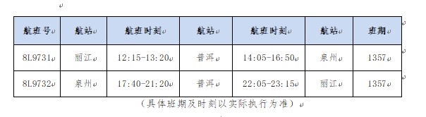 据介绍,祥鹏航空丽江=普洱=泉州航线目前是三地间独飞航线,每周一、三、五、七执飞。去程航班号为8L9731,12:15从丽江起飞,13:20抵达普洱,14:05从普洱起飞,16:50抵达泉州;回程航班号为8L9732,17:40从泉州起飞,21:20抵达普洱,22:05从普洱起飞,23:15抵达丽江。