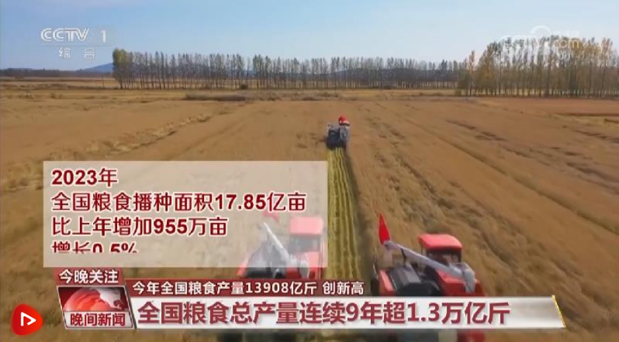沃野丰穰,五谷归仓。国家统计局12月11日发布数据显示,全国粮食总产量为13908.2亿斤,比上年增长1.3%,再创历史新高,连续9年稳定在1.3万亿斤以上。