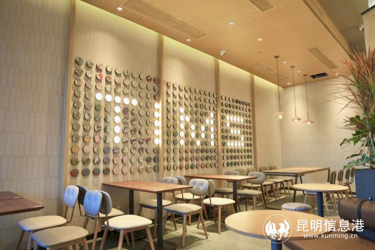 值得一提的是,Tims昆明万象城店也是西南地区首家绿色环保店。店内的圆桌、会议桌、菜单板和墙面,都采用“秸秆混合咖啡渣”的环保板材定制设计。