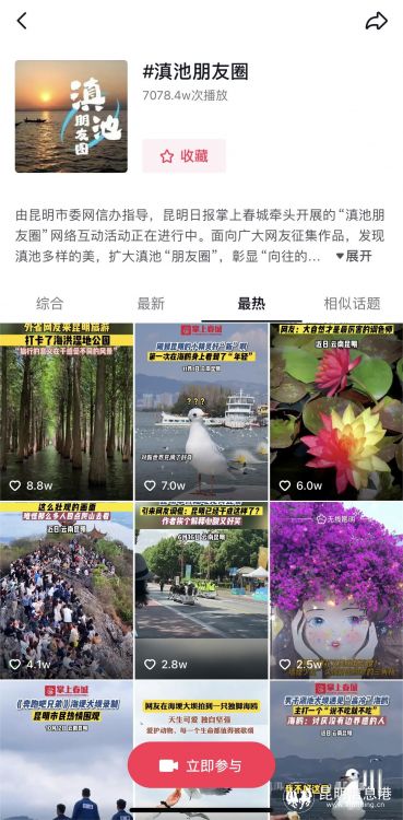 由昆明市委网信办指导、掌上春城主办的“滇池朋友圈”网络互动活动于2023年4月正式启动。该活动联动各市级网媒和各县级融媒体中心,利用网站、客户端、微博、抖音等平台开展短视频的征集展播及互动,系统呈现昆明的城市发展变化,展现云南昆明的美丽与美好。截至11月30日,“滇池朋友圈”全网阅读1.5亿,其中微博话题阅读量达8615万,抖音话题6603万,微博讨论量互动量近3万次,持续在网络上掀起“滇池朋友圈”互动热潮。