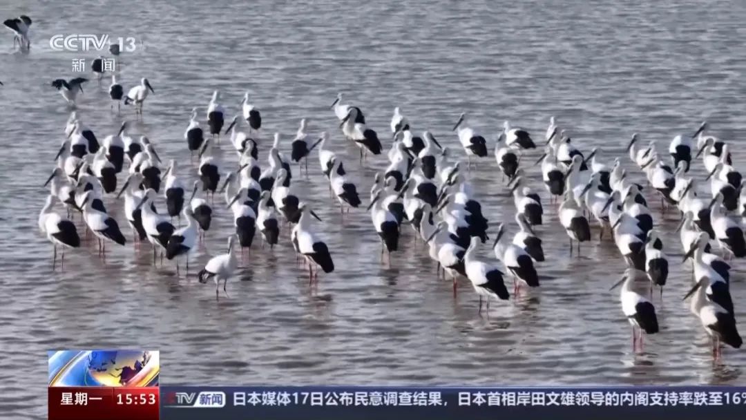 中国科学院昆明动物研究所助理研究员 伍和启:一个因素是近期随着保护力度的加大,东方白鹳的种群数量在恢复。第二个因素是它主要的越冬地——长江中下游地区,近两年遭受了干旱。在种群数量增长、一些适宜栖息地减少的背景下,东方白鹳群体存在着向外扩散、去寻找适合生活环境的这样一个本能。