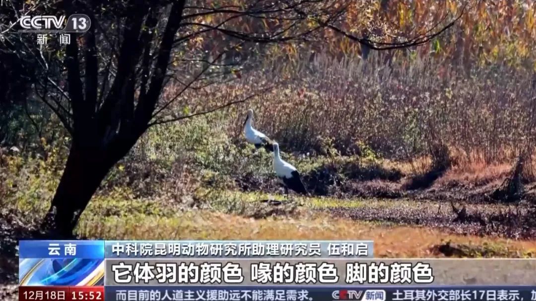中国科学院昆明动物研究所助理研究员 伍和启:经过对照图鉴的一些判别,包括体羽的颜色、喙的颜色、脚的颜色,初级飞羽、次级飞羽的这种黑色,通过这一系列特征判定,这个个体就是东方白鹳。