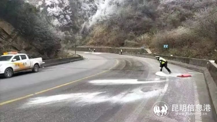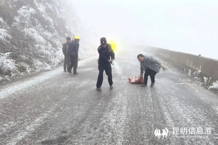 彝良交警对辖区内结冰路段展开巡逻,并抛洒融雪剂,进行除冰工作。