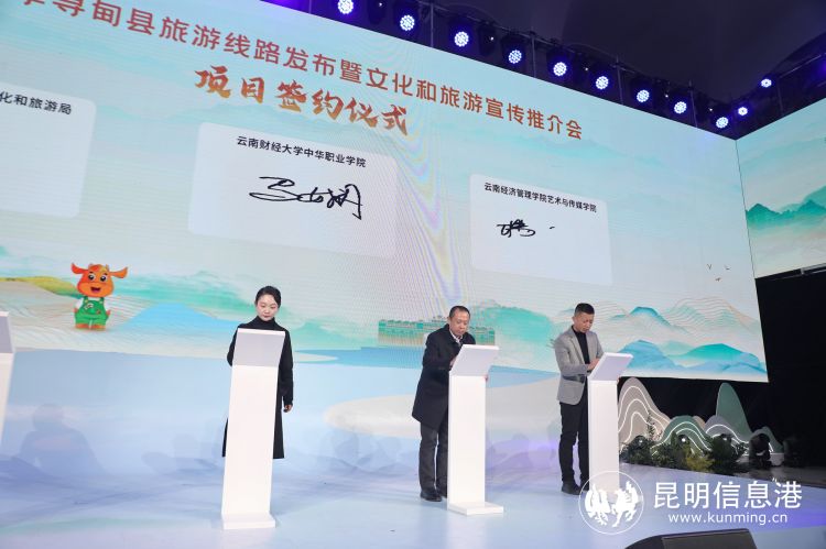 推介会现场,云南财经大学中华职业学院、云南经济管理学院艺术与传媒学院与寻甸县文化和旅游局就下一步开展文旅产学研校政合作进行项目合作签约。未来,三方将围绕文艺精品创作、旅游文创开发、对外宣传推介、文旅人才培育等方面多维度加强合作,实现平台共建、信息互通、资源共享。
