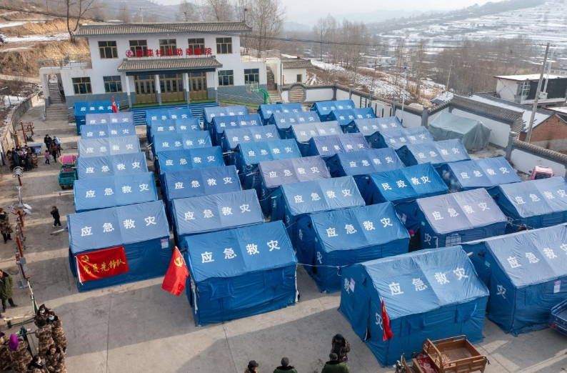 12月23日,甘肃临夏州积石山县柳沟乡尕集村幸福互助院前的一片水泥地上,37顶应急帐篷整齐排列,党旗招展,“党员先锋队”旗帜格外醒目。人民网记者 翁奇羽摄