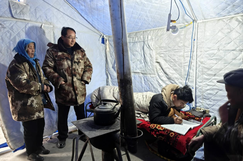 12月23日,在积石山县柳沟乡尕集村五社安置点,柳沟乡副乡长马力克正在了解高三学生安秀文的复课情况。人民网记者 翁奇羽摄
