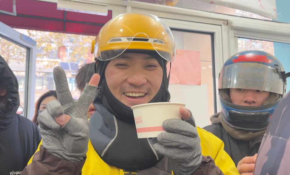 驿站里,骑手们正在通过饮用红豆汤取暖。新华社记者 徐思钰 摄