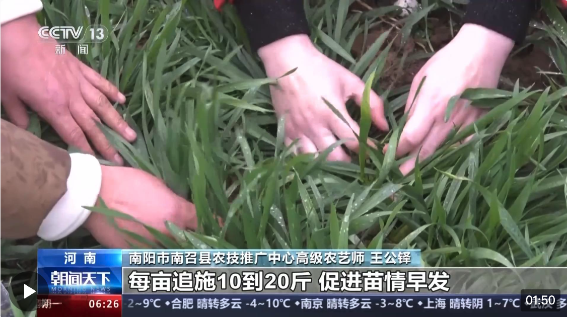 南阳市南召县农技推广中心高级农艺师 王公铎:要施入农家肥或者喷施防冻剂来预防冻害的发生。对苗情较弱的三类田块,要抓住这次降雨降雪的时机,追施复合肥或者尿素,每亩追施10斤到20斤,促进苗情早发。