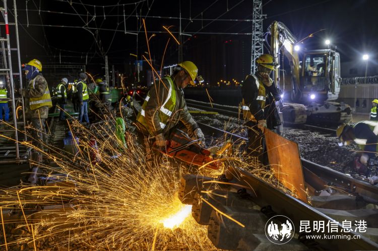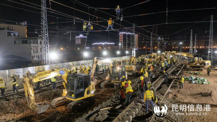12月24日23时15分,随着最后一趟动车缓缓驶过,调度命令下达,中铁二局450名作业人员、50多台机械设备有序进场,按照既定交底的工作任务展开各项工作;回流线搭设、钢轨断开、轨排横移、人工扒砟、拨移线路、回填道砟、线路捣固、道床整理、大机捣固及安设栅栏等每一道工序有条不紊地进行。