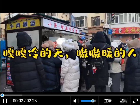“那么一大串烤串5块钱,豆浆2块”“这包子真大啊”“烤冷面夹臭豆腐,我头一次吃,好吃”,赞叹之声不绝于耳。记者走进道里菜市场时,这里已是摩肩接踵,身穿浅色系羽绒服搭配可爱毛绒帽子的外地游客成了人群的主流。