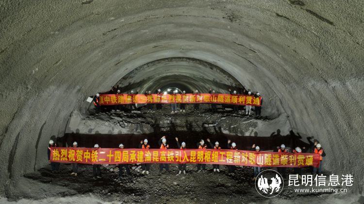 昆明信息港讯 记者上官艳君 12月28日,经过建设者600余天的昼夜奋战,由中铁二十四局承建的渝昆高铁云南段新对歌山隧道安全贯通,为全线早日通车奠定了基础。至此,今年渝昆高铁云南段桥梁、隧道和路基等站前工程建设任务顺利完成。