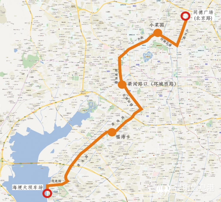 途经站点:北京路口(白云路)(起始站)、小菜园、新闻路口(环城西路)、福海乡、海埂大坝车场(终到站)。