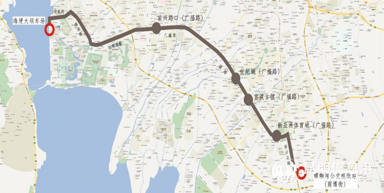 起终站:螺蛳湾公交枢纽站(商博街)(起始站)——海埂大坝车场(终到站)。