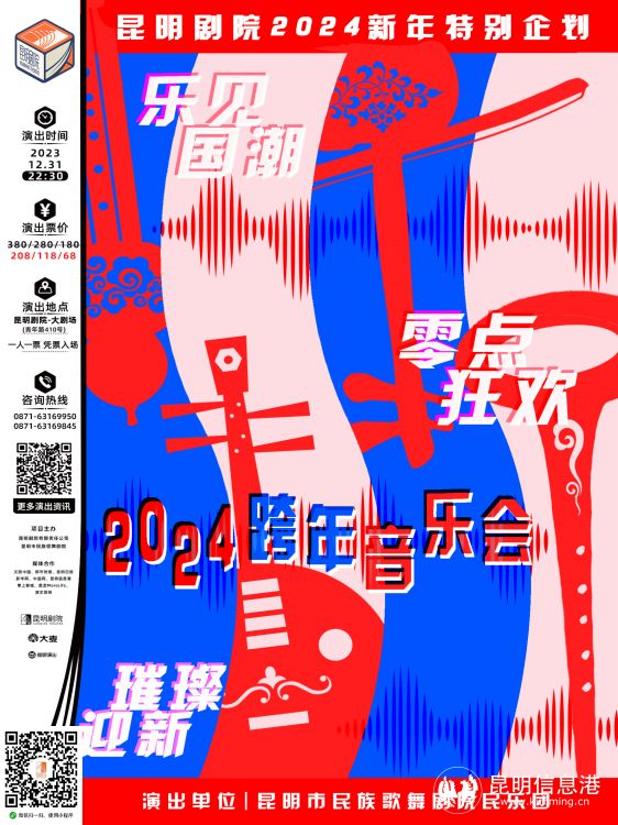 2023年12月31日,《2024跨年音乐会·乐见国潮》将在晚上22:30拉开序幕,狂欢至次日凌晨,留下独一无二的跨年时刻!本场跨年音乐盛宴由昆明剧院x昆明市民族歌舞剧院联合主办,由昆明市民族歌舞剧院民乐团倾情献艺:精心选曲,呈现仅闻其声未见其姿的各类民族器乐。整场演出伴随音乐旋律,鲜花簇拥、舞台璀璨、现场精心布置的打卡点、书法名家笔墨贺新。除以上诚意满满的活动外,昆明剧院“美食分号”将成为全场最大显眼包:精美甜点、剧院出品暖心热红酒等,让观众身临国潮其境的同时,美酒美食美乐美照美心情,五感尽欢!