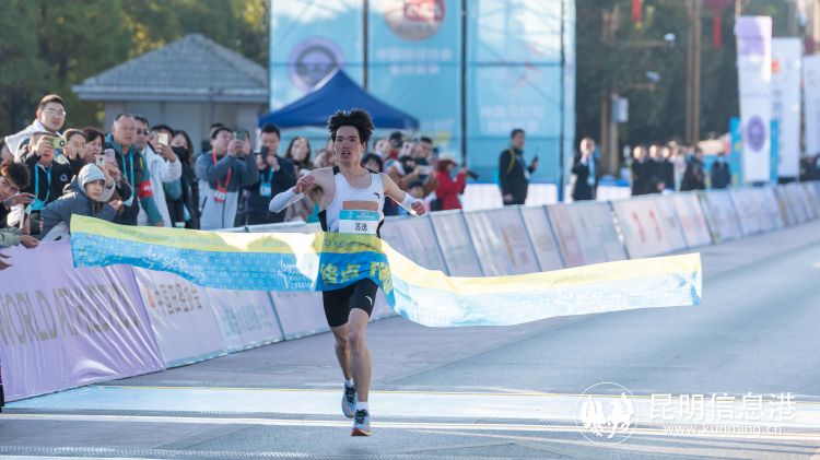 男子半程马拉松冠军苏逸冲线瞬间 记者王竣彦/摄