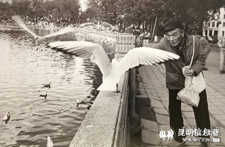 退休后每年冬天海鸥来临就成了他的精神寄托,吴庆恒老人总会从城郊步行二十多公里来到翠湖公园。他挎着一个蓝布袋,里面装着自制的鸥粮,每天坚持喂养这些远道而来的小精灵。