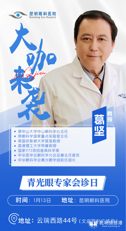 疑难青光眼专家葛坚教授1月13日出诊昆明眼科医院