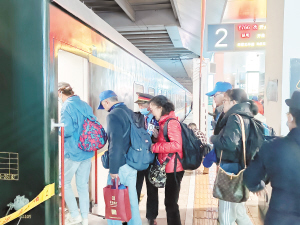 游客登上云南省内环线旅游列车“象往号”。