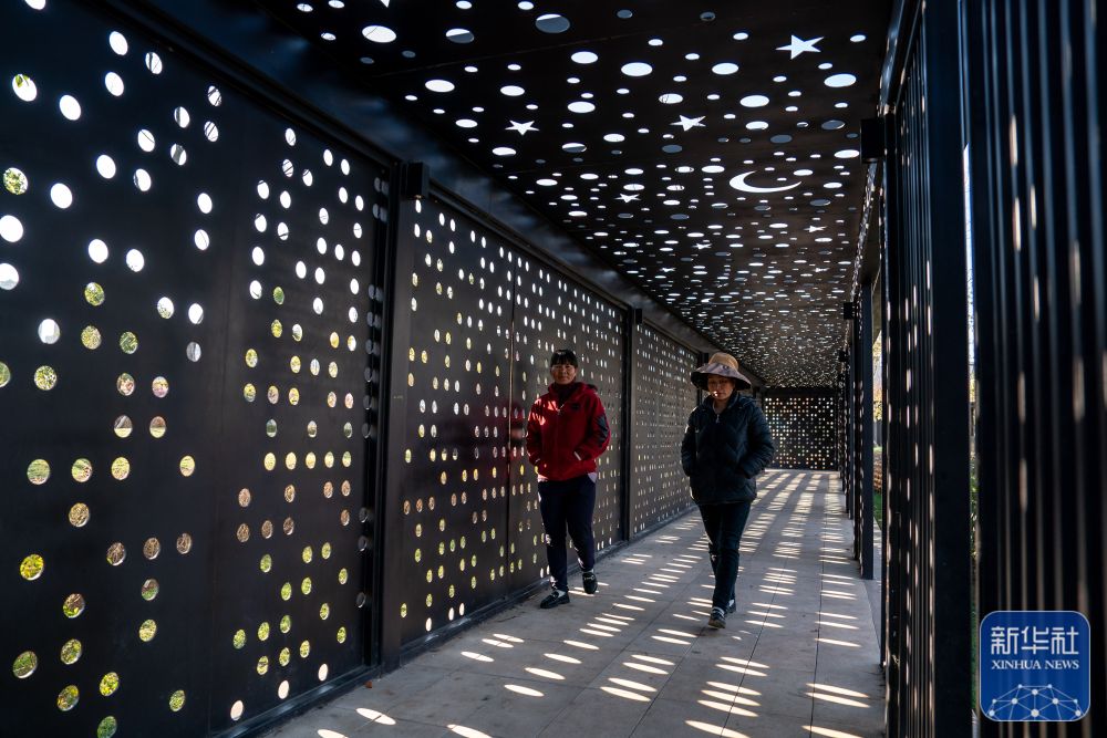 ↑市民在昆明市五华区普吉公园星空长廊内散步(1月12日摄)。