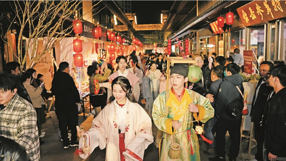 “古与今”“传统与潮流”在赭溪老街巧妙融合。荣小馆、鸿姐老火锅、钟书阁等多家知名品牌闪亮登场,书香、茶香、酒香中处处透着“潮”气息,雅集、小型音乐会、“文艺赋美”文艺演出等在街区的各个角落不间断上演。游客还能在不经意间偶遇“李白”“济公”“徐霞客”等文人雅士,可以打卡特色“非遗”,沉浸式感受唐宋时期的市井繁荣。据介绍,元旦假期,赭溪老街游客接待超40万人次。