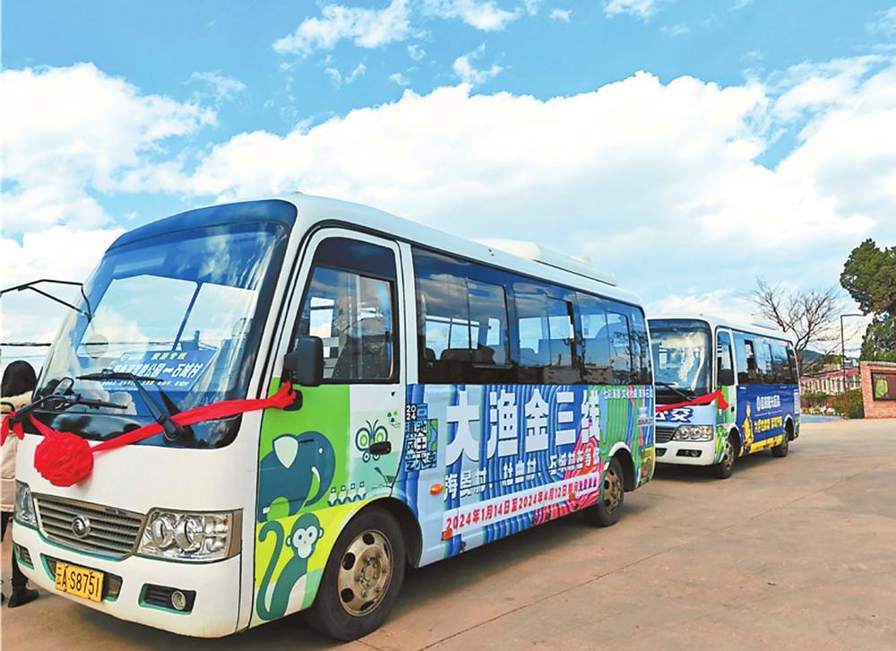 17座的“大渔金三线”旅游专线公交从捞渔河湿地公园始发,终点站为石城村循环复线,途经站点有捞渔河公园、罗家村、大海宴(环湖东路)、杜曲村、石城村,全程8公里,运营时间为上午10点到下午6点,1小时一趟,整点发车,每天共9趟。(云南日报 实习生杨菁娜 记者熊明)