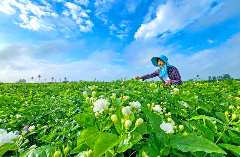 如今,小小茉莉花已经成为名副其实的乡村振兴“致富花”,2023年,横州茉莉花鲜花平均价格达每公斤34元,带动34万花农增收致富,人均收入从2019年的1.27万元增长至2.1万元。