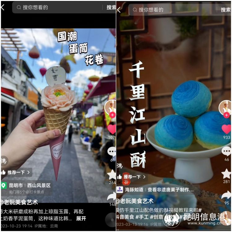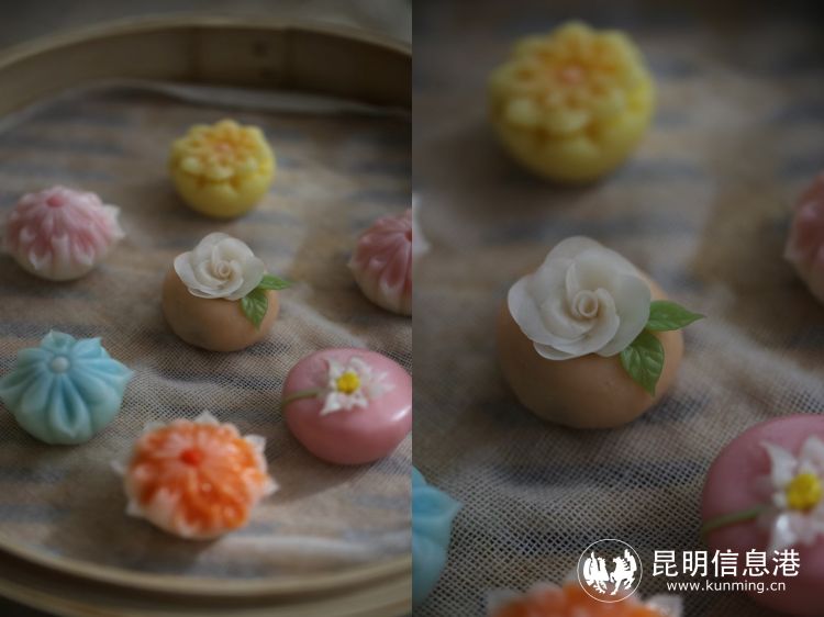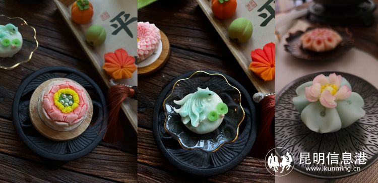 我会在各大社交平台发布教程视频,制作菓子的原材料是云南特有的白芸豆,视频发布定位是我工作室所在的西山风景区,唐菓子的外形以昆明市的市花茶花为灵感,从制作到传播过程,将云南、昆明的特色借助网络平台走向全国。
