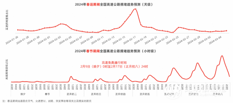 春节期间,预计2月11日(正月初二)上午时段全国高速交通压力较大,2月12日(正月初三)至14日(正月初五)高速拥堵呈M型特征分布,2月15日(正月初六)至17日(正月初八)返程拥堵高峰明显,尤其是2月17日(正月初八)出行最为集中,拥堵高峰时段为14时至19时。而春节后,预计元宵节后一天2月25日(正月十六)全国高速将出现一波返程小高峰。
