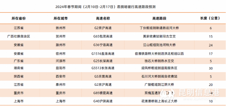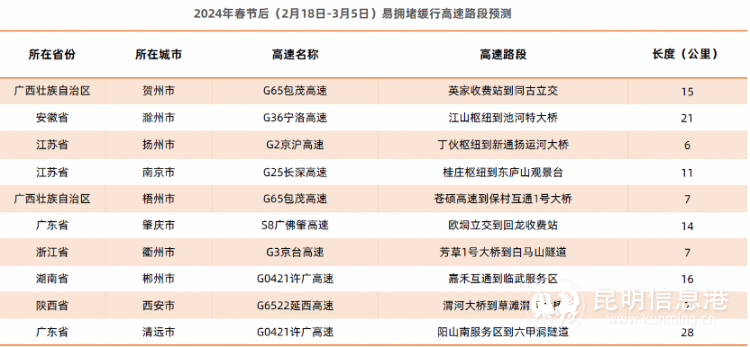 春节后,预计全国高速易拥堵路段主要是G65包茂高速贺州段(英家收费站到同古立交),其次是G36宁洛高速滁州段、G2京沪高速扬州段等。