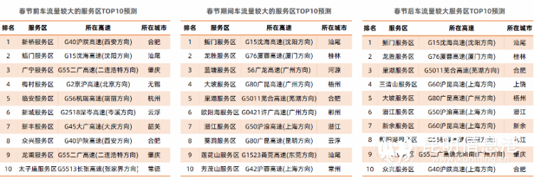 高速服务区方面,预计春节前车流量较大服务区主要有新桥服务区(G40沪陕高速东向西)、鲘门服务区(G15沈海高速西向东)、广宁服务区(G55二广高速南向北)。