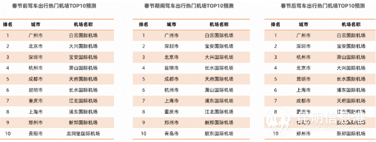 机场方面,预计春节前驾车出行热门机场主要有广州白云国际机场、北京大兴国际机场、深圳宝安国际机场。预计春节期间,驾车出行热门机场主要有广州白云国际机场、深圳宝安国际机场、北京大兴国际机场。春节后,预计广州白云国际机场、深圳宝安国际机场、杭州萧山国际机场驾车出行热度较高。