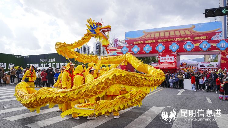 开街仪式现场,过年的仪式感“龙”重登场,耍龙游行一向是澄江迎新闹春的必备节目,一条红龙一条金龙拉开澄江市龙年“龙凤澄祥”的美好祝愿,寓意龙跃在澄,新一年喜气洋洋。