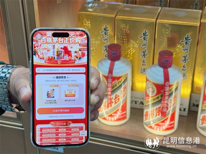 该活动提供150瓶500毫升的53度茅台酒,以茅台集团指导价出售,没有其他加价。活动从1月29日持续至3月4日,年满18周岁的永辉生活会员,活动期间在永辉超市昆明世纪金源购物中心店线上渠道、门店渠道完成实付金额满108元的单笔订单,就可以获得系统派发的金币,参与预约抽奖。中奖了,就可以在“永辉生活”App下单购买指定茅台酒。收到提货通知后,即可在指定日期到门店自提。