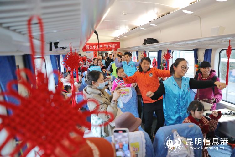 8时51分,列车从黑井站开出,车厢里的旅客又多了不少。“都说火车是流动的驿站,今天咱们这趟车也变成了流动的集市,我们还为大家准备了丰富的文艺活动。”随着主持人开场,铁路工作人员和铁路青年志愿者们打起了手鼓,唱起了《最炫民族风》,载歌载舞,浓浓的年味在车厢里萦绕。