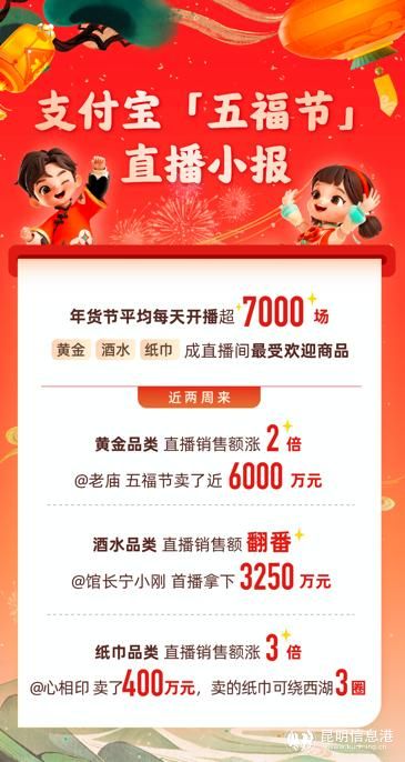 如今,各大平台直播间已成为消费者年货采购的新渠道。今天,支付宝开放平台发布数据称,五福年货节期间,平台上平均每天有超7000场直播,其中,酒水、黄金、纸巾等三大品类最受用户欢迎,近两周的直播销售额环比涨幅分别达到了100%、200%和300%。