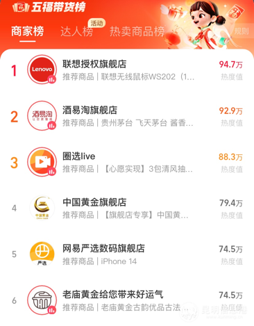 支付宝五福带货榜页面显示,酒水、黄金、纸巾品牌占据了商家榜单的半壁江山。