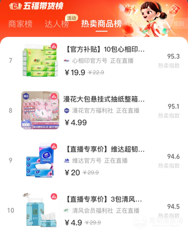 并且,支付宝五福节直播的热卖商品榜单前10名中,纸巾类产品占大半。记者点进支付宝直播发现,多个纸巾品牌直播间的观看量破百万人次。