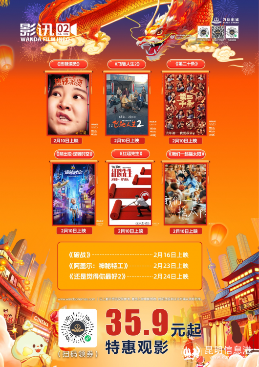 截至2月14日12时,2024年春节档电影票房超过50亿元,其中《热辣滚烫》《飞驰人生2》《熊出没·逆转时空》分别位列票房榜前三名。为了回馈广大影迷、营造更加浓厚的观影氛围,即日起,万达影城发放10万张35.9元起观影优惠券,扫下方二维码或到万达影城前台即可领取限量专属福利。
