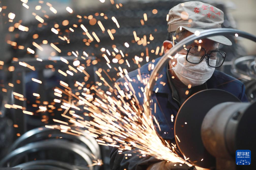 2月18日,在浙江省杭州市临安区天目山镇一家外贸企业,工人对自行车钢圈进行抛光。新华社发(胡剑欢摄)