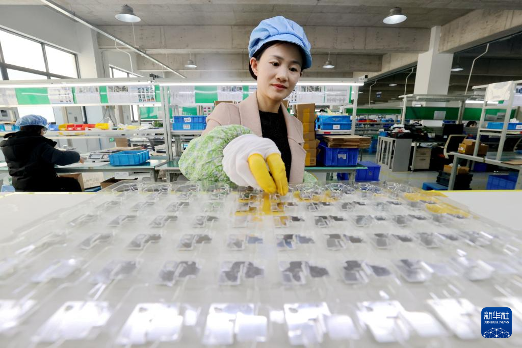 2月18日,在浙江省湖州市德清县禹越镇一家精密部件生产企业,工人在赶制新能源汽车电池配件产品。新华社发(谢尚国摄)