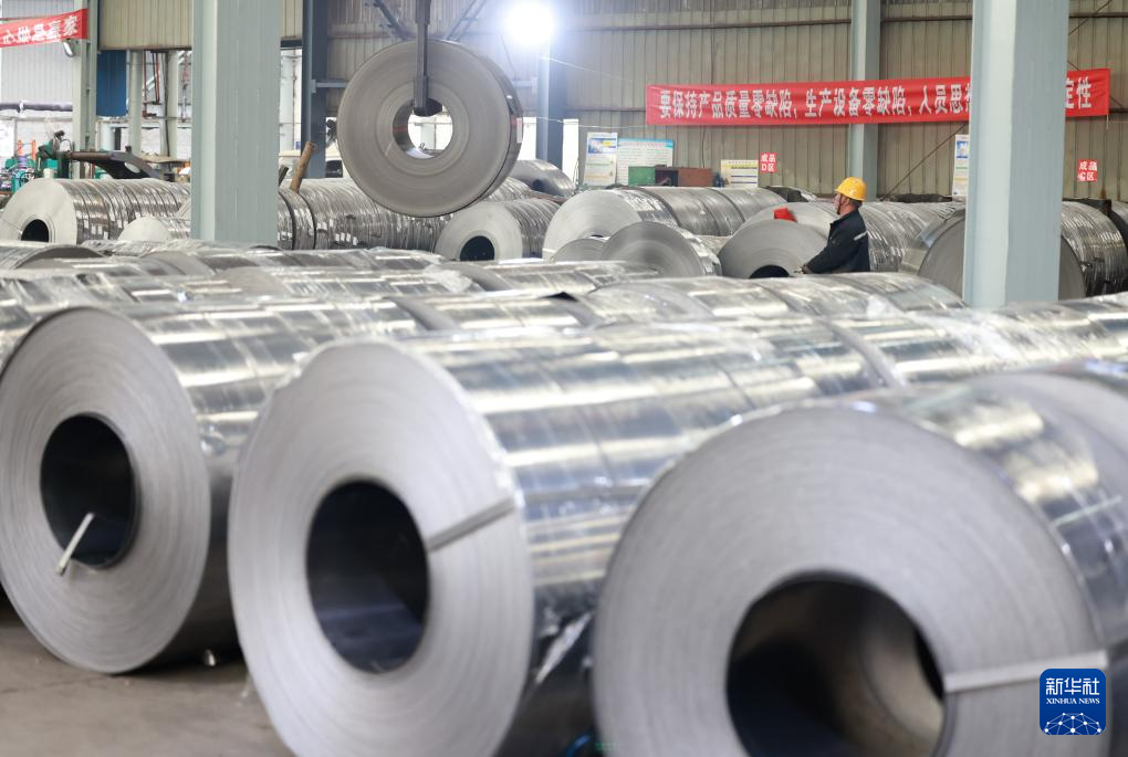 2月18日,在安徽省合肥市肥东县一家钢铁企业,工人操作设备吊装成品钢卷。新华社发(阮雪枫摄)