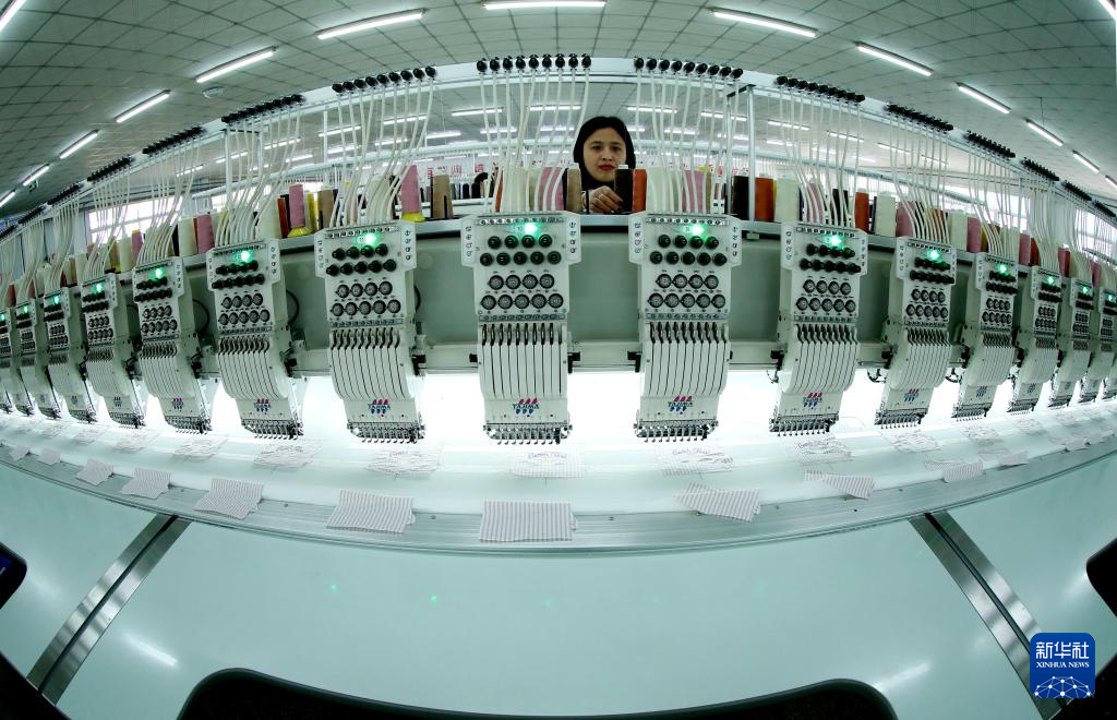 2月18日,在位于山东省青岛市即墨区的青岛颐和针织有限公司,工人在生产服装绣花产品。新华社发(梁孝鹏摄)